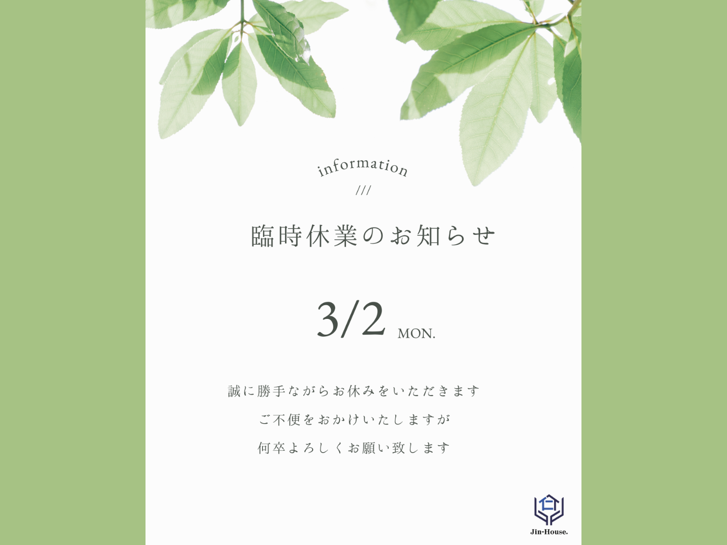 臨時休業のお知らせ✨