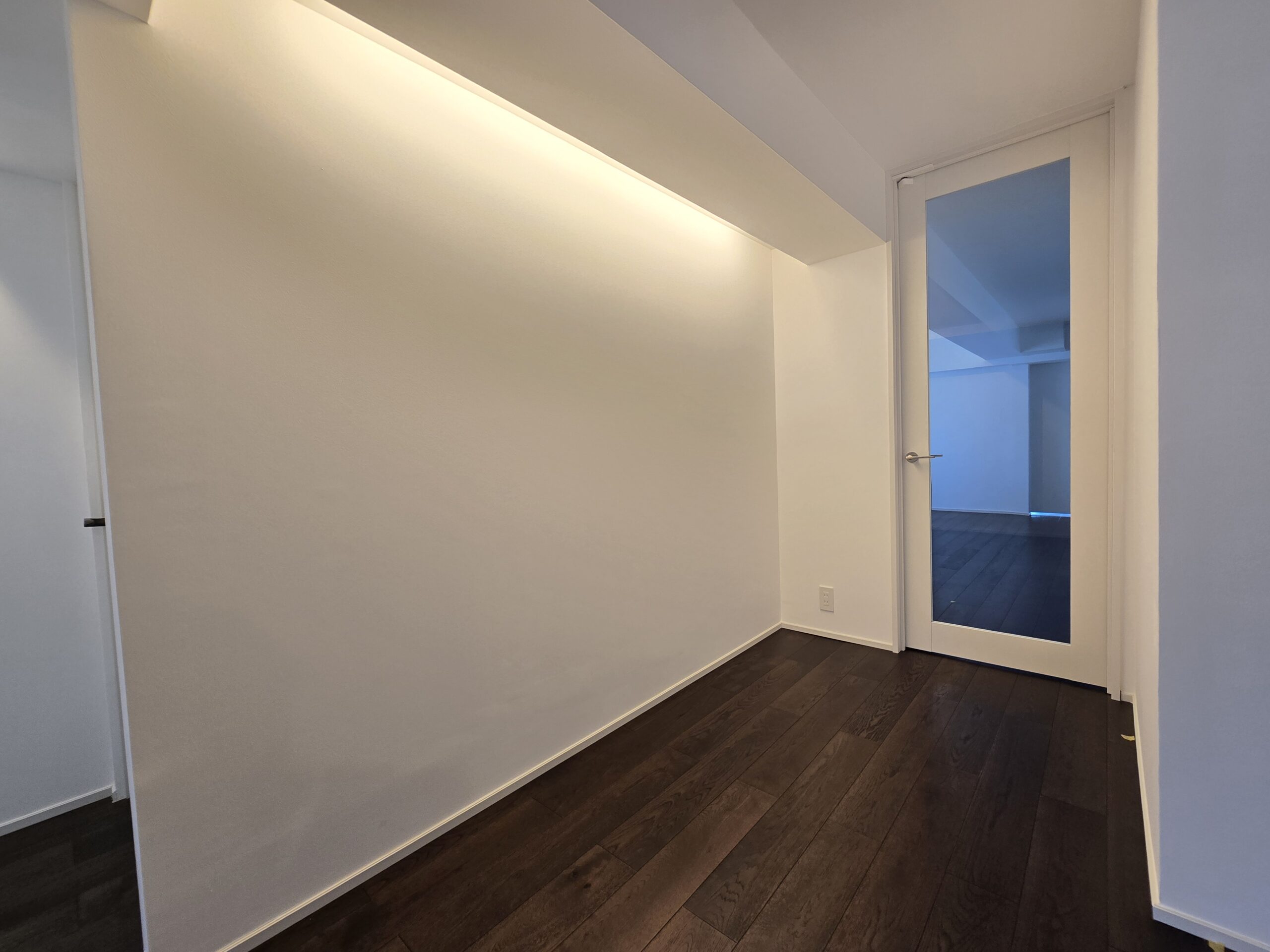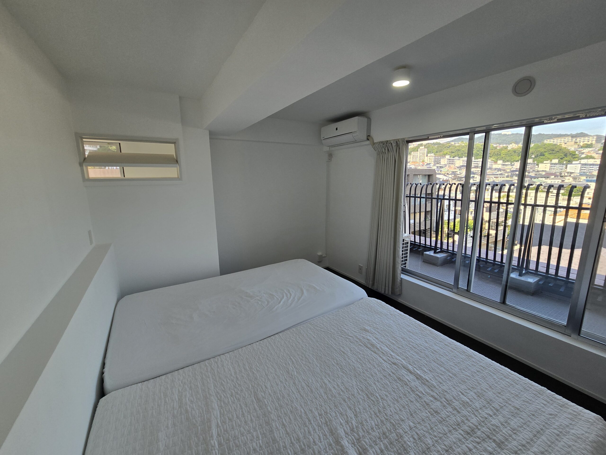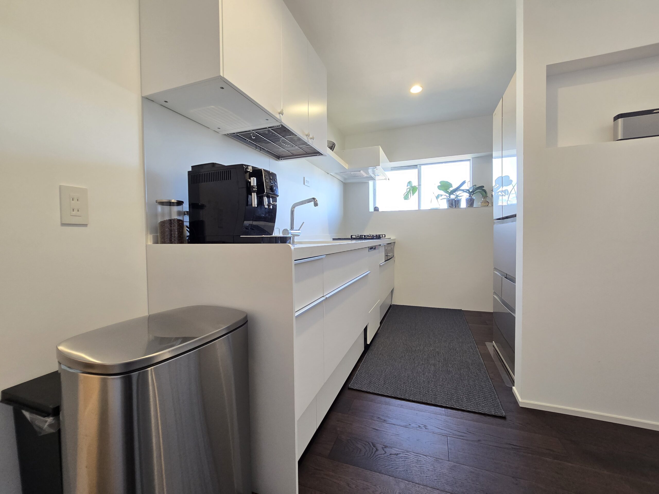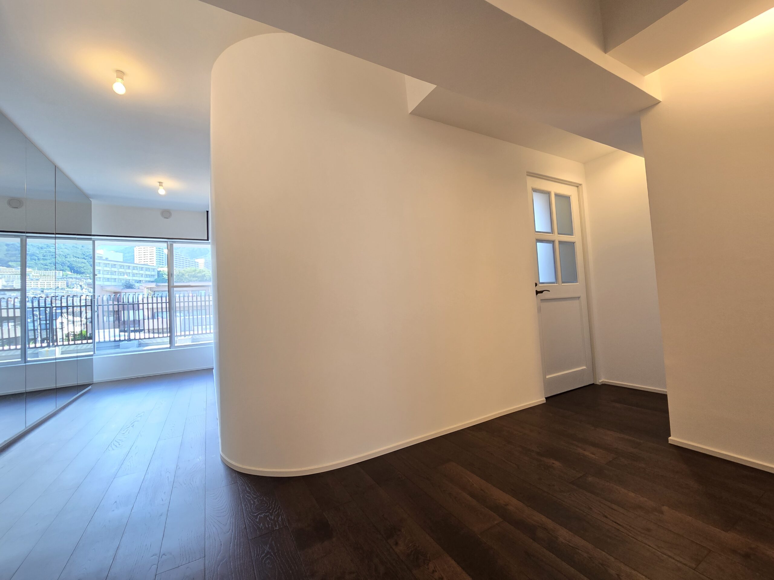 眺望が良いため、普段はカーテンが見えないように隠す造作壁でLDKをスッキリさせております。